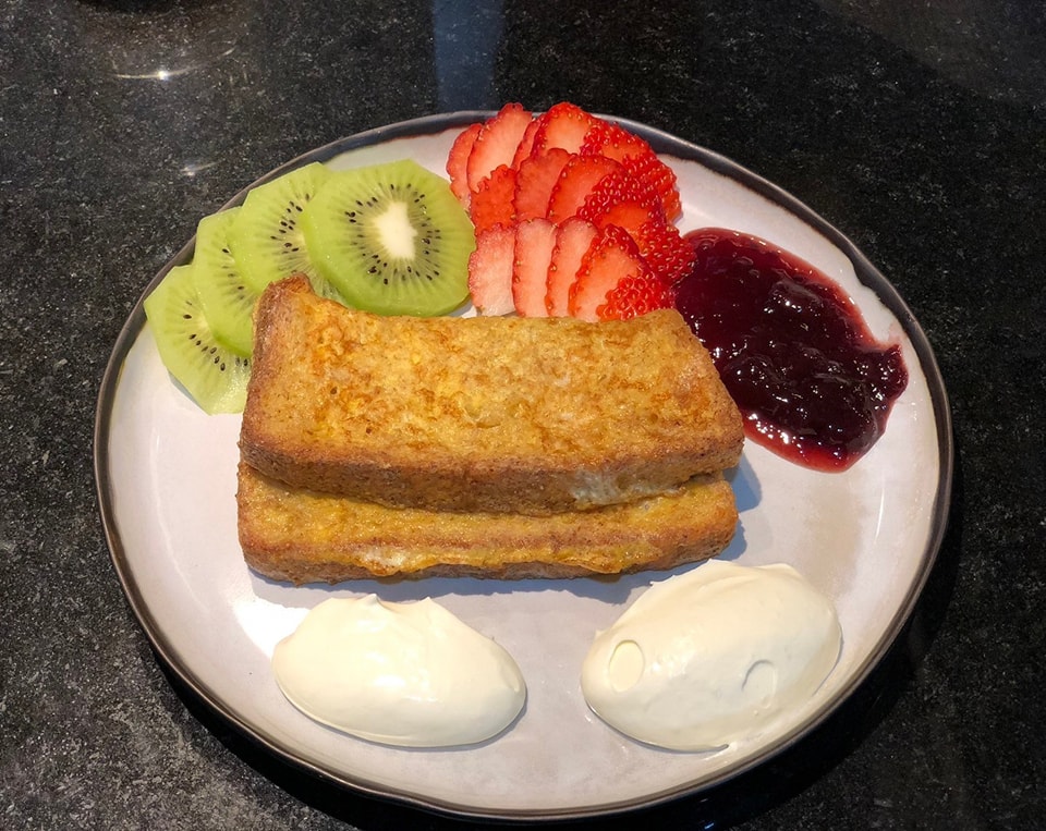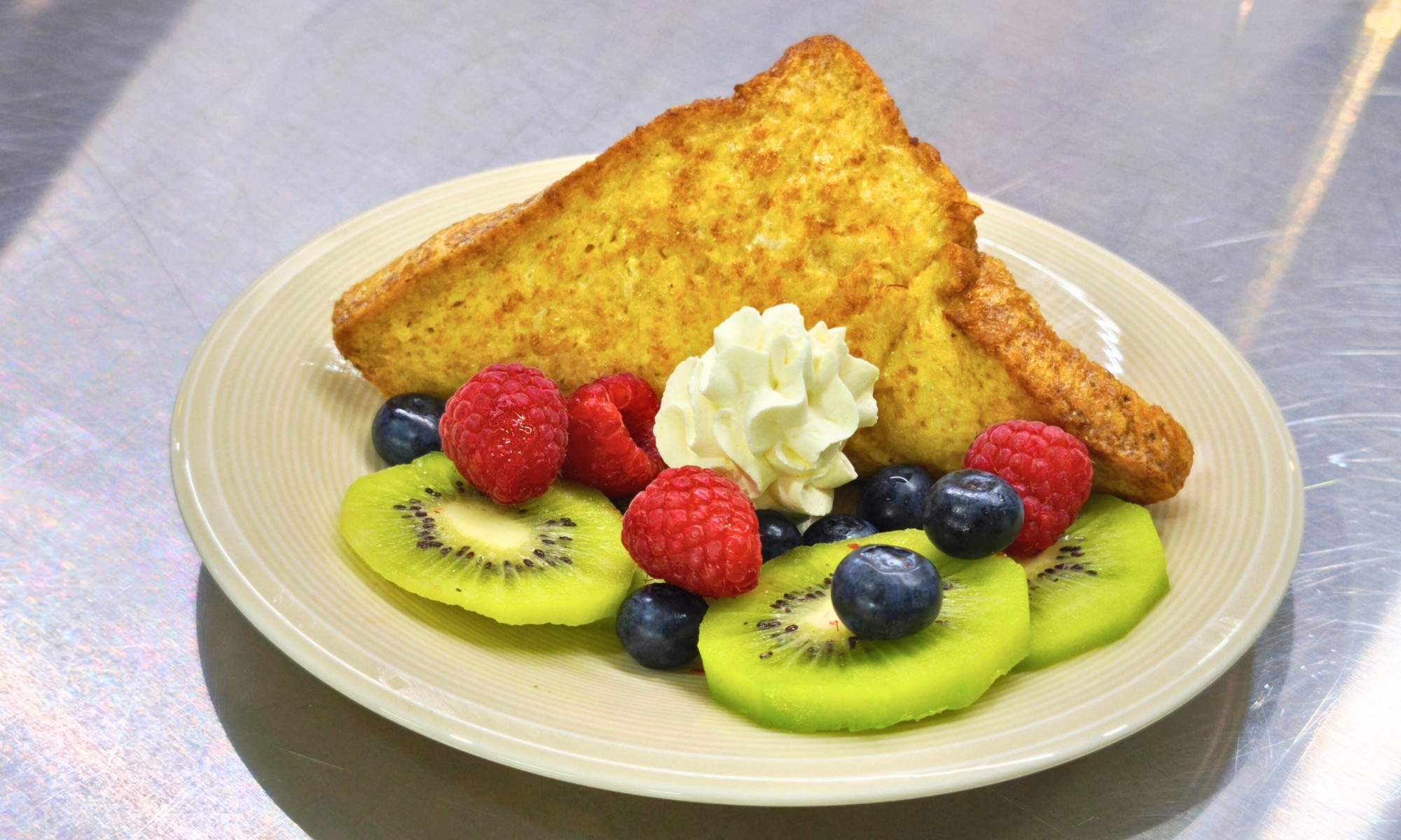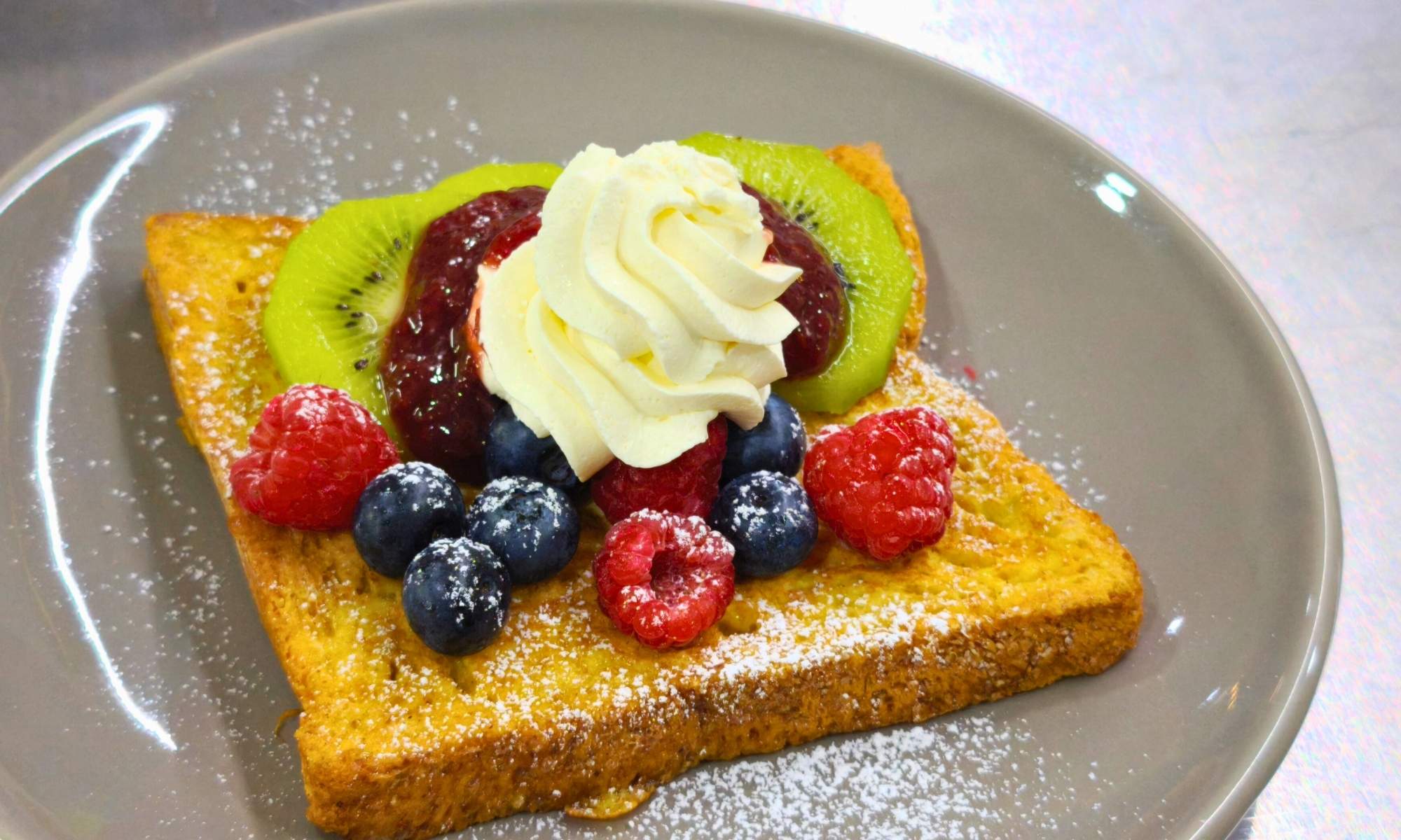 - French Toast : จัดจานคู่กับผลไม้รสเปรี้ยว แยม ราดน้ำผึ้ง และ ตกแต่งด้วย Whipped Cream